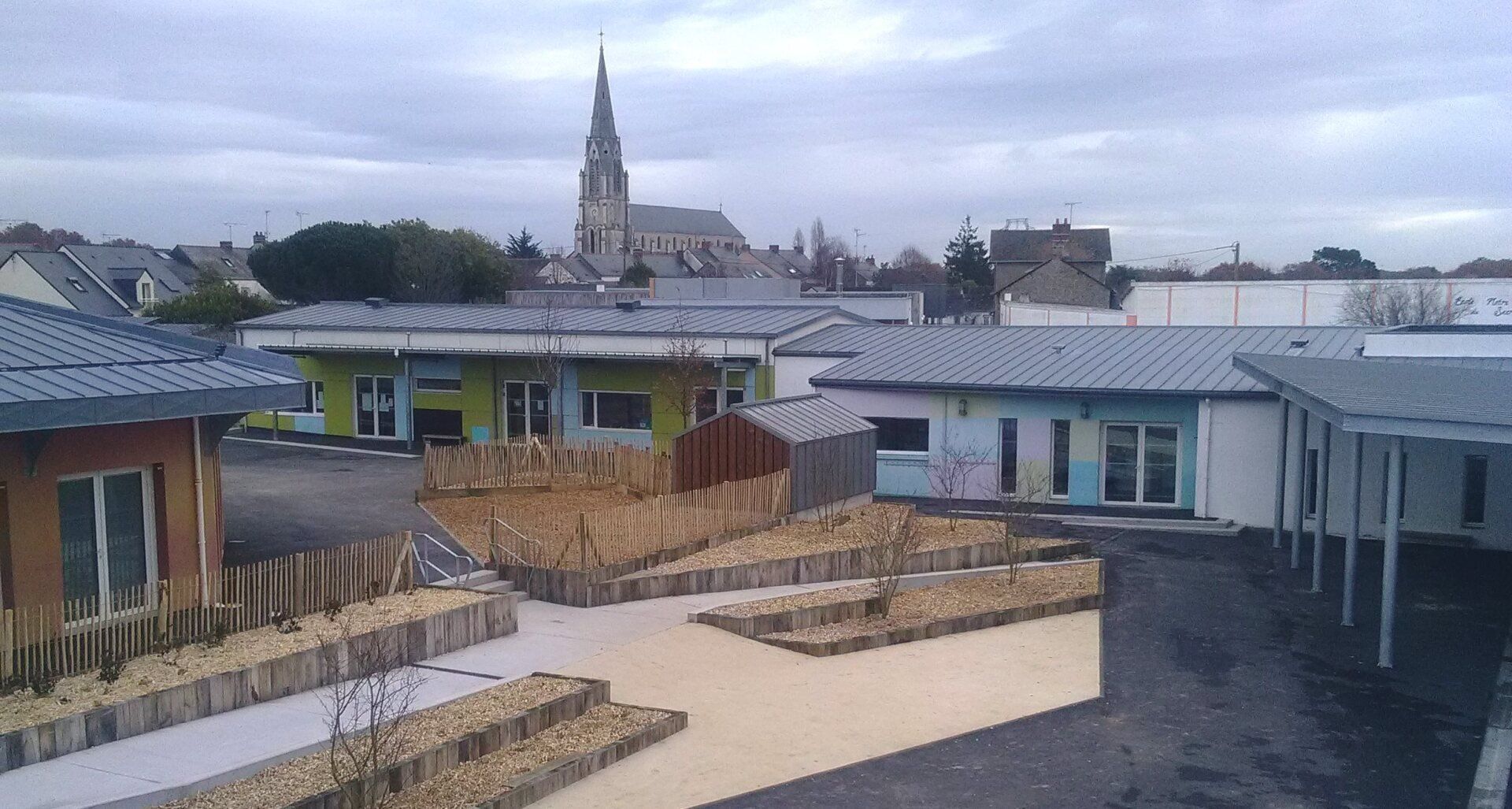 SAVENAY - Extension groupe scolaire Robert Desnos - Couverture zinc joint debout 176 m² - Couverture préaux en plaques polycarbonate réf. Polypac 239 m² - Bardage zinc joint debout 231 m² et bardage aluminium réf. Préfa 236 m² avec isolation par l'extérieur. Chantier public.