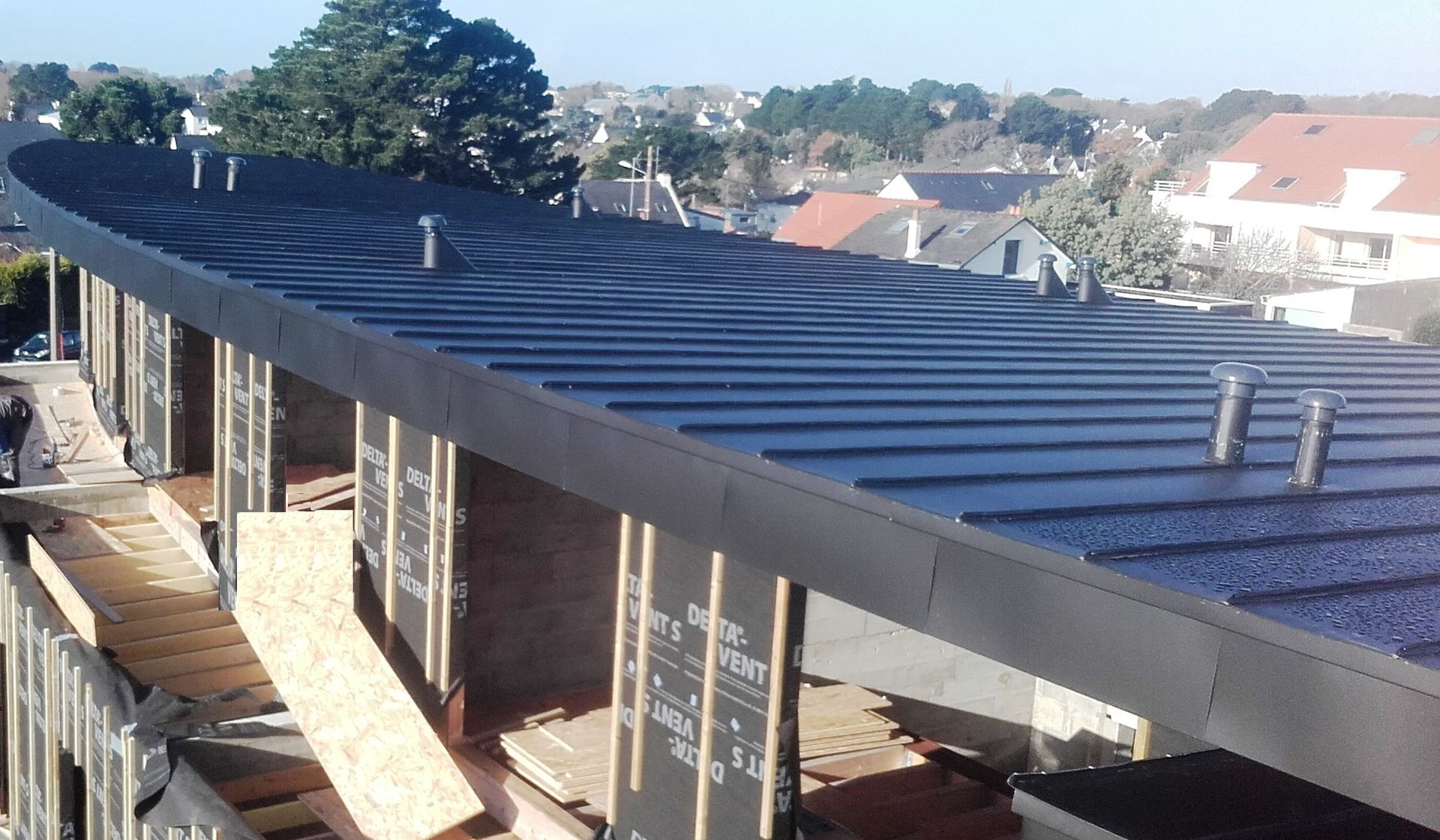 SAINT MARC SUR MER - Construction immeuble - Couverture 351 m² et bardage 250 m² en aluminium noir, habillage auvent et sous-faces immeuble en aluminium noir joint debout 109 m².